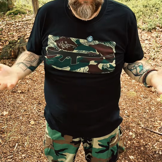 Базовий шар одягу. Традиційна футболка з коротким рукавом і круглим вирізом. Міцна і дихаюча трикотажна бавовняна тканина щільністю 180 г/м2 з якісним принтом, чудово поєднується з іншими елементами гардеробу. На передній частині футболки є великий принт із зображенням гвинтівки FN FAL на тлі родезійського камуфляжу (Rhodesian Camo).